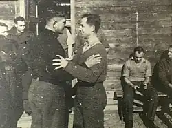 On August 29, Anton returned to the worksite and told Leslie to stand by. While fetching water on August 30, Anton intercepted Laws and told him to rendezvous in the woods at a determined time later that afternoon. Word was passed to the other seven, and all but Phil Tapping were able to extract themselves from the worksite and make the rendezvous.[15] The raid had been cancelled, and Anton escorted the seven POWs through Pohorje to Lovrenc na Pohorju (German: Sankt Lorenzen am Bachern), recently seized by the 'Ljubo Šercer' Brigade. There, Leslie and Ralph were introduced to 'Ljubo Šercer' Brigade deputy-commander Jože 'Silni' Boldan, the commander of the Brigade's 3rd Battalion commander Ivan Kovačič (not to be confused with Ivan 'Efenka' Kovačič), and two unnamed members of Cuckold mission.[16]