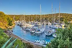 On 14 May a commemoration for the victims of the sinking of Marin II was held on the Prirovo cemetery on Vis, after which the recovered remains were laid to rest in a shared grave.[38] On 17 May, the RM NOVJ Headquarters issued a critical report on the sinking with the decision to sail away from Vis being among the first to be questioned. According to the report, the ship should have made an attempt at reaching one of the deserted coves on Vis instead of sailing to open sea and exposing itself to possible air and naval attack.[39] However, according to Matković (1966, p. 250) the commander of Marin II indeed attempted that: with the port engulfed in flames from the bombing, he tried reaching the closest cove on Vis, only to be fired upon by Partisan shore batteries prompting him to sail about 2 nautical miles (3.7 kilometres) fom the Stončica lighthouse.[40] Another point made by the RM NOVJ Headquarters was directed at the crew's continued futile attempts at signaling the German boats believing they were being attacked by mistake, when instead they should have used the precious time to attempt a dash towards Vis in an effort to come under the protection of the shore batteries or at least beach the ship to try and prevent a total loss of the ship and its crew. Further criticism was directed at other Partisan vessels due to their lack of an appropriate response. Several ships located in the Stončica cove witnessed the clash, but made no effort in sailing out and investigating or providing assistance in its aftermath. Similarly, the commander of the sailboat Jadran which was sailing from Šolta to Vis observed the clash, only to proceed straight towards the port of Vis after it was finished instead of providing assistance.[39] Pribilović (1988, p. 245) notes that the task of securing the area of operations was the responsibility of the Allies. Though one side of the area was covered by a patrol at Cape Ploča near Rogoznica, the other side of the area was left unsecured. He further considers that neither the Allies nor the RM NOVJ Headquarters had reliable intelligence regarding the presence of German torpedo boats in Boka Kotorska.[41]