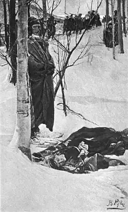 For the 109 English captives, the raid was only the beginning of their troubles.[44] The raiders intended to take them to Canada, a 300-mile (480 km) journey, in the middle of winter. Many of the captives were ill-prepared for this, and the raiders were short on provisions. The raiders consequently engaged in a common practice: they killed those captives when it was clear they were unable to keep up. Williams commented on the savage cruelty of the Indian raiders; although most killings were "not random or wanton",[43] none of those killed would have "needed to" be killed had they not been taken in the first place. Most (though not all) of the slain were the slow and vulnerable who could not keep up with the party and would likely have died less quickly en route.[45] Only 89 of the captives survived the ordeal. Survival chances correlated with age and gender: infants and young children fared the worst, and older children and teenagers (all 21 of whom survived the ordeal) fared the best. Adult men fared better than adult women, especially pregnant women, and those with small children.[46]