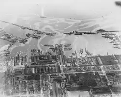 ![]() Aerial photograph of Kronstadt harbour taken on 26 July 1919. The positions of Soviet vessels did not change significantly before the raid. The depot ship Pamiat Azova is berthed at the end of the central pier (right of the middle 'x'), the battleships Petropavlovsk and Andrei Pervozvanny are moored at the end of the pier on the right. A guardship lies just outside the harbour. | |||||