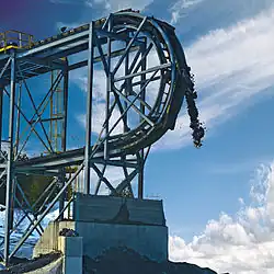 The Railveyor system incorporates a remotely operated electrically powered series of two wheeled railcars driven by power stations located along on a light-rail track.[8] Because the cars are remotely operated and compact in size, they can be used as an enabling technology for rapid development and high speed production at the working face. The Railveyor system can reduce capital costs and infrastructure, travelling below shafts and in spaces as small as 10 by 12 feet or 3.05 m by 3.66 m.[9] Using multiple train systems in tandem optimizes continuous material haulage.[10] The railcars can travel at variable speeds up to 18 mph, or 8 metres/second, and climb grades of 20%.[11] The company claims that the system combines the best features of conveyors, rail, and truck haulage, including travelling on 20% inclines, increased capacity and availability, reduced installation time, a small profile, and a short turning radius of 95 feet or 30 m.[12] The system is used for underground and surface applications in the mining and aggregate industries.