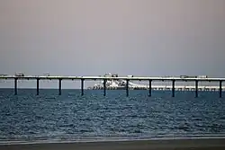 Bemo Rail of Warmenhuizen in the Netherlands laid the track onto the pier for transporting workers and equipment to the platform, which is 4 km away from the coastline, at which tankers can be filled with LNG, because they cannot come closer to the coast because the water is very shallow. Bemo also supplied two battery operated rail vehicles made in 1993 and 1997/98, as well as a motorless passenger car and some flat cars for tools. The locomotives get their energy from batteries and are explosion proof, for instance with stainless steel wheels. They can transport 10 passengers each. The original description was RCE-15 (Rail Car Electric, 15 kN (1,5 t) pulling force). Now it has been renamed to BRE-15 (Bemo Rail Electric). The maximum speed is 15 km/h. In 1999 the first locomotive was equipped, similarly to the second locomotive, with an AC asynchronous motor instead of the DC motor.[14] Two older explosion proof rail cars and trailers were delivered by Alan Keef in England.[15][16][17][18][19]