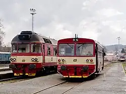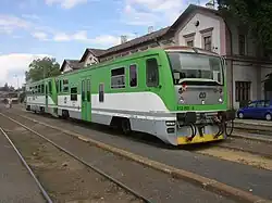 Rail transport in the Czech Republic carried 193.5 million passengers in 2019,[2] and 68.37 million tonnes of cargo in the year 2009.[3] The majority of passenger services run nowadays are operated by the state company České dráhy (Czech Railways), which until 2007 also managed cargo services now run by ČD Cargo. In 2009 the country had 9,420 km of standard gauge track, 3,153 km of which is electrified.[3] There are two main electrification systems in the Czech Republic, 3 kV DC in the northern part, and 25 kV 50 Hz AC in the south (in addition, one historical 24 km long line uses 1.5 kV DC; and since 2009 one short local line to Austria uses 15 kV 16.7 Hz AC). Locomotives had to be changed on boundaries in the past, two-system locomotives have been introduced in 1974. The network has same gauge links to all four countries bordering the Czech Republic (Slovakia, Austria, Germany and Poland) with passenger services to all four countries in operation. Major hubs for international passenger services on the network are in Prague, Ostrava, Brno and Břeclav,[4] and the busiest station (by number of passengers) is Praha hlavní nádraží. The maximum speed for passenger traffic is 160 km/h (100 mph).