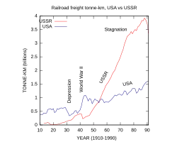 The graph compares the freight traffic (in tonne-km) of the USSR to the US.[18] The USSR rebuilt its rail system and industrialized with five-year plans. As a result, railway freight grew about 20 times from 20 to 400 billion tonne-km by 1941.[19] But then disaster struck again, World War II began. In the first year or so of the war, traffic plummeted to about half its prewar value. But then the USSR started restoring and constructing railways during wartime so that by the end of the war about half of the lost traffic had been recovered. After the war was over it took a few more years to restore the railways and get back to the pre-war level of traffic.