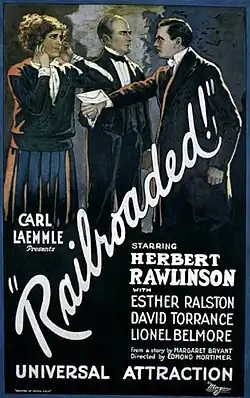 Railroaded is a 1923 American silent drama film directed by Edmund Mortimer and starring Herbert Rawlinson, Esther Ralston and David Torrence.[1][2]