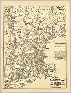 The war saw the peak of United States rail mileage, with a total of 254,000 route miles.[18] After the war, railroad mileage in New England began to shrink, in line with national trends.[13]