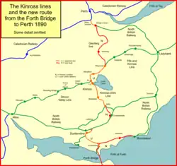The Forth Bridge was fully opened for all traffic on 2 June 1890. It required a number of enhancements to the main line routes of the North British Railway leading to it. The Kinross route was transformed into part of the main line from Cowdenbeath to Perth, and the entire route section from Kelty to Mawcasrse Junction was doubled and upgraded for main line running.