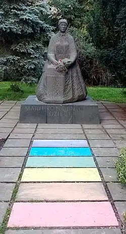 ![]() LGBTQ activists hang the rainbow flag on the Maria Konopnicka monument in Kraków in August 2020 | |||