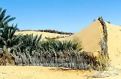 The Sahel is dappled with "unproductive crusty patches" found on "old dunes, sandy plains, colluvial slopes, and alluvial terraces."[29] These "glazed" patches are regionally known as glacis and are found, for example, on approximately 60 percent of all degraded land in Niger.[31] "Glacis" describes a slope made particularly slippery, for whatever reason, and is related to the Old French glacier.[32] Glacis patches in the Sahel are more or less impermeable; rainwater runs off or evaporates, further immiserating the soil biome, and thus the plants and the people.[31]