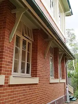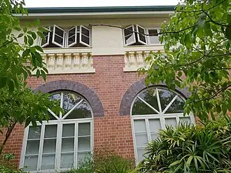 Despite their similarities, each Depression-era brick school building was individually designed by a DPW architect, which resulted in a wide range of styles and ornamental features being utilised within the overall set. These styles, which were derived from contemporary tastes and fashions, included: Arts and Crafts, typified by half-timbered gable-ends; Spanish Mission, with round-arched openings and decorative parapets; and Neo-classical, with pilasters, columns and large triangular pediments. Over time, variations occurred in building size, decorative treatment, and climatic-responsive features.[37] The Chief Architect during this period was Andrew Baxter Leven (1885–1966), who was employed by the Queensland Government Works Department from 1910 to 1951, and was Chief Architect and Quantity Surveyor from 1933 to 1951.[38] The DPW architects involved in the design of Rainworth State School were Raymond Clare Nowland and Harold James Parr.[39][1]