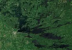 Geologically Rainy Lake is part of the Superior Craton of the Canadian Shield and retains features associated with it, such as a large, ancient caldera and fault lines that can be clearly seen in satellite images of the lake.[11] The Rainy Lake - Seine River Fault zone is a strike-slip fault zone passing through Rainy Lake from Tilson Bay in the southwest to Seine Bay in the northeast.[12]