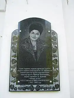 In honor of Raisa, a memorial plaque was inaugurated at her parents' home on 13 October 2005, and a church was constructed in the village of Koreshchyna.[9] The home at 40 Sichovykh Striltsiv Street in Kyiv, where she resided from 1997 to 2005, has a memorial plaque placed on its exterior.[7] In Cherkasy, a bust was built in 2018 close to the Regional Philharmonic building.[10] In addition to the sculpture of her placed on Raisa Kyrychenko Street outside the Public Poltava administration building on 13 October 2012, a memorial plaque was also placed on the home where she resided in Poltava on 13 October 2005.[9] The Raisa Kyrychenko Museum in Poltava, which is housed within the Poltava V.G. Korolenko National Pedagogical University, preserves her legacy.[7] The singer's records, outfit, shoes, and old pictures are all shown on different cassettes in the museum.[5]