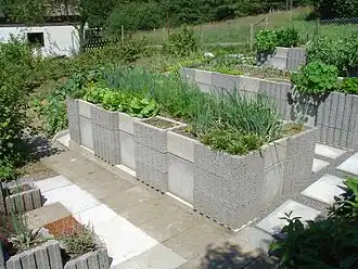 Raised-bed gardening is a form of gardening in which the soil is raised above ground level and usually enclosed in some way. Raised bed structures can be made of wood, rock, concrete or other materials, and can be of any size or shape.[1] The soil is usually enriched with compost.[2]
