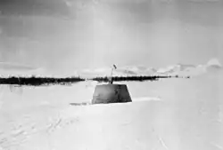 Raising the Flag on the Three-Country Cairn[Note 1] is a historic photograph taken on 27 April 1945, which was the last day of the Second World War in Finland. It depicts a Finnish Army patrol of Battle Group Loimu, Infantry Regiment 1 (Finnish: taisteluosasto Loimu, jalkaväkirykmentti 1), raising the Finnish war flag on the three-country cairn between Norway, Sweden, and Finland. As the cairn marked the westernmost point on the Finnish mainland, this symbolized that the last German troops were gone from Finland. The photograph was taken by the commander of Infantry Regiment 1, Colonel Väinö Oinonen (alternatively V. J. Oinonen). It became a widely circulated symbol of the end of World War II in Finland.