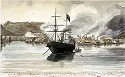 HMS Vixen firing on Pengiran Yusof's house and battery
