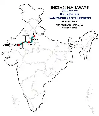 The 12464 / 12463 Rajasthan Sampark Kranti Express runs from Jodhpur Junction via Merta Road Junction, Degana Junction, Makrana Junction, Jaipur Junction, Alwar Junction, Delhi Cantt to Delhi Sarai Rohilla.