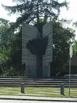 Following the joint German-Soviet invasion of Poland, which started World War II in September 1939, the village was occupied and annexed by Nazi Germany. In connection with the construction of the Auschwitz II-Birkenau death camp in nearby Brzezinka, in 1941, the occupiers expelled the entire Polish population of the village, which was initially deported to the nearby Pszczyna County, and afterwards either enslaved as forced labour or deported to the General Government in the more eastern part of German-occupied Poland.[4] Vacated buildings were partially demolished, and a subcamp of the Auschwitz concentration camp was established in the village.[5] Men and women of various nationalities and ethnicities, initially mostly Polish, but later also Jewish, Russian, French, Yugoslav and German, were held in the subcamp as forced labour.[5] On January 18, 1945, the subcamp was dissolved and the prisoners were sent on a death march towards Wodzisław Śląski, from which they were eventually deported to the Ravensbrück concentration camp in Germany.[5] After the war, the village was restored to Poland.