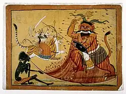 ![]() Durga slays Raktabīja as Kali drinks his spilt blood. | |