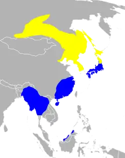 The species is mainly migratory, wintering in southern Japan, eastern China and northern Borneo. It is uncommon in northern parts of Bangladesh,[6] Burma, Laos,[11] and northern and central Thailand,[12][13] and does not normally reach further south in mainland southeast Asia.[11] Migrants have been recorded on Sri Lanka in the past, although on the Indian mainland they are found mainly in the northern regions, with a few records from as far south as Mumbai.[14][15] On arrival in India, rails may be so exhausted that they can be caught by hand.[5] The breeding birds on the Japanese island of Hokkaido mostly migrate well south including to Korea but a few remain during winter in the coastal marshes of Honshu.[16][17]