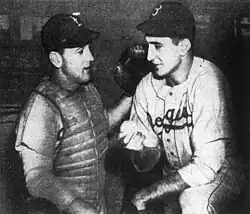 On Opening Day in 1947—which was also Jackie Robinson's major league debut—Branca lined up on the field beside Robinson, while other players refused.[8] That year, he had a 21–12 win–loss record and a 2.67 earned run average (ERA) in 280 innings pitched. He earned his first All-Star appearance and helped the Dodgers win the National League pennant.[9] He was second in the league in wins, innings pitched, and strikeouts (148), third in ERA, and sixth in won-lost percentage (.636).[7] Branca was also the starting pitcher in Game 1 of the 1947 World Series.