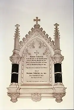 His tomb, which has Grade II listed building, is in a railed-off section of the churchyard of Christ Church, Virginia Water, Surrey, England. His devoted wife and dedicated conservationist, Marianne née Vaughn-Richards, who survived him by 35 years, is buried alongside him.[1] The marriage bore five children – Maria Teresa, born 1852; Ramon Alexander, born 1854; Ferdinand Augustus, born 1856; Charles Leopold, born 1860; and Ada Constance, born 1862.