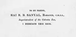 Ram Brahma Sanyal (1850 – 13 October 1908) was the first Indian superintendent of the Alipore Zoological Gardens in Kolkata (then Calcutta). He was a pioneer in captive breeding, and was one of the first zookeepers trained as a biologist. He was a corresponding member of the Zoological Society of London and wrote a handbook on keeping and breeding animals in captivity – A Handbook of the Management of Animals in Captivity in Lower Bengal (1892) which was reviewed in the journal Nature (4 August 1892).[2][3] This was the standard handbook for zookeepers for over 50 years until Lee Crandall published The Management of Wild Mammals in Captivity in 1964. His scientific methods led to the rare birth of a live Sumatran rhinoceros in 1889, an event that was not seen in captivity until 2001.[4][5][6]