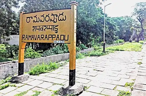 Ramavarappadu railway station (station code - RMV) is an Indian Railway station in Vijayawada of Andhra Pradesh.[1][2] It is situated on Vijayawada–Nidadavolu loop line of Howrah–Chennai main line and is administered by Vijayawada railway division of South Coast Railway zone.[3] It is categorized as a Non-Suburban Grade-6 (NSG-6) station in the division.[4] It is an important station alongside Ramavarappadu, for devotees during the annual Mary Matha festival, celebrated at Gunadala Matha Shrine.[5]
