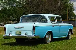 The four-door Ramblers for the 1956 model year were completely redesigned, with a characteristic swept-back C-pillars (the Fashion Safety Arch),[6] unusual wing windows on the rear doors,[7] inboard, grille-mounted headlamps,[8] as well as "the widest windshield" of any car.[7] The short-wheelbase two-door (Nash Rambler) versions were no longer available. The new line retained the 108-inch (2,743 mm) wheelbase that was used for the previous four-door versions of the Nash Rambler, but the overall length was increased by 5 inches (127 mm), to 191.14 in (4,855 mm). The Rambler was substantially smaller outside compared to the other popular domestic cars of the era, but its interior room was equal to the top-selling "low-priced" field.[8][9] Construction was also unusual, being unit body (what Nash called Double Safe Single Unit).[6]