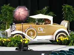 Johnson had purchased the car from a junkyard in 1956. Johnson and his son, Craig, would restore the car as a father-son project while Craig attended the Georgia Military Academy.[19] The two spent two years and over $1,800 restoring the vehicle.[20] Johnson used spare parts from many different sources to refurbish the rusty hulk. He bought the mahogany dash from a parts dealer in Caracas, Venezuela and used Convair 440 aluminum sheets to replace the flooring. After Craig graduated from high school, he attended Florida State on a track scholarship. In 1960, Craig's track team would be in Atlanta competing against Tech. Johnson, wanting to see his son compete, took the Model A to Tech campus, parked it near Towers dormitory, and went to watch Craig compete.[20]