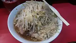 Ramen Jiro (Japanese: ラーメン二郎, Hepburn: Rāmen Jirō) is a Japanese chain of ramen shops founded by Takumi Yamada. Yamada opened the first Ramen Jiro in Meguro, Tokyo in 1968.[1] As of 2018, there are approximately 40 locations across Japan, over 30 of which are in the greater Tokyo area.[2] Ramen Jiro is known for its large portions and its distinctly flavored broth, which enthusiasts call "Jirolian style."[3][4] In 2009, The Guardian included Ramen Jiro on its list of "The 50 best things to eat in the world".[5]