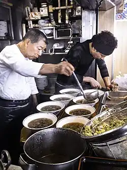 A ramen shop typically specializes in ramen dishes, and may provide other foods such as gyōza. In Japan, ramen shops are sometimes referred to as ramen-ya or ramen-ten.[1][2] Some ramen shops prepare all of their foods in-house "from scratch", including the soups, broths and ramen noodles,[3] while others use prepackaged prepared noodles and other prepared ingredients.[4] As of 2016, over 10,000 ramen shops exist in Japan.[5]