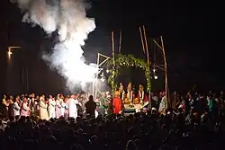 Traditionally organised in a makeshift open-air theatre at night, it is usually staged by amateur acting teams drawn from all segments of the society.[2][25] Singers and musicians, men and women, elderly and youth play different parts, sing the verses to music, recite dialogues. The recitations and the narrative of the play are usually based on Ramacharitamanas. The dialogue is improvised, and often responsive to audience reactions. Dhol drummers and other musicians participate. The atmosphere is usually festive and free, with the audience whistling and commenting as the story proceeds. The stage is surrounded by food stalls and larger productions have a fair nearby. Surrounding areas temporarily transform into bazaars to cater to the audience. A committee (samiti) heads the preparation.[25] In many rural areas, traditional venues for Ramlila have developed over the centuries, and hundreds of people will often make the trip nightly to attend the play, by walking over miles like a religious pilgrimage in earlier times. Actors typically don't get paid, or get paid little for their efforts, but they are provided free food and accommodation by the villagers or committee. Performance costs are usually financed by fundraising in the community, often by self-organized Ramlila Committees.[2][25][27] The early-twentieth-century poem Radheshyam Ramayan by Pandit Radheshym Kathavachak is commonly used in Ramlila theatre because of its commentary on the political climate at the time in addition to the use of simple language and symbolism. The dialogue within the poem suit the "themes and dramatic styling" of Ramlila's performance for both battle scenes and more "rousing" scenes.[28]