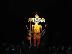 Ramlila or Ramleela (Sanskrit: रामलीला, romanized: Rāmalīlā; literally 'Rama's lila or play') is any dramatic folk re-enactment of the life of Rama according to the ancient Hindu epic Ramayana or secondary literature based on it such as the Ramcharitmanas.[1] It particularly refers to the thousands[2] of the Hindu god Rama-related dramatic plays and dance events, that are staged during the annual autumn festival of Navaratri in India.[3] After the enactment of the legendary war between good and evil, the Ramlila celebrations climax in the Vijayadashami (Dussehra) night festivities where the giant grotesque effigies of evil such as of the rakshasa (demon) Ravana are burnt, typically with fireworks.[4][5][6] Rama is the seventh avatar of the Hindu deity Vishnu and the central figure of the Ramayana, a Sanskrit epic that integrates performance arts with stories driven by ethical values. The epic text is dated to the 1st millennium BCE and Ramlila is an adaptation of those stories. Most Ramlilas in North India are based on the 16th-century secondary work on Ramayana, Ramcharitmanas a verse form composition in the regional vernacular language (Awadhi a dialect of Hindi[7]), by Tulsidas.[4][6][8] These verses are used as dialogues in traditional adaptations. Open-air productions are staged by local Ramlila committees (Samitis), and funded entirely by the villagers or local neighbourhoods in urban areas.[9] The core team of performance artists train for the dance-drama, but the actual performance attracts impromptu participants from the audience and villagers.[4] This art form is a part of the Hindu culture, found for many gods and goddesses, but those of Rama, Durga (as Durga Puja) and Krishna (as Rasalila) are the most popular and annual events in the Indian subcontinent.[1]