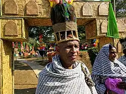 The sect's adherents do not drink or smoke, chant the name of Ram every day,[7] tattoo the word "Ram" on their body, and wear a shawl with the word "Ram" printed on it and a headgear made of peacock feathers. Those with full body tattoos are knows as "purnanakshik" and are mostly in their seventies; the younger generations of Ramnamis are no longer tattooed, fearing that they might be discriminated against and denied work because of the tattoos.[4] Ramnamis gather every year for a three-day Bhajan Mela at the end of the harvest season in December–January in the village of Sarsiwa in Raipur district where they erect a jayostambh (a white pillar with the name of Ram inscribed on it) and chant from the Ramcharitmanas.[4]