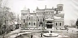 In 1879 Tsar Alexander II gave the estate of Ramon to his niece Princess Eugenia and the Duke of Oldenburg as a wedding gift. In 1883 they commissioned construction of the palace, in red brick, in the style of an English Gothic castle with gatehouse. The architect is usually said to have been Christopher Neysler,[1][2] but some sources attribute the design to Nicholas Benois.[3] The building used "foot bricks" manufactured according to a traditional process involving peasants treading the clay into wood frames for firing.[3]