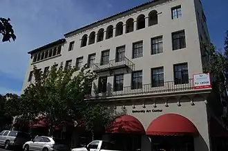 The Ramona Street Architectural District, in downtown Palo Alto, California, is a Registered Historic District. This portion of the street, between University Avenue and Hamilton Avenue, is a highly distinctive business block. It showcases the Spanish Colonial and Early California styles with gentle archways, wrought iron work, tile roofs of varying heights and courtyards.