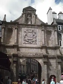 The Saint-Jean Gate takes its name from the nearby chapel of the same name, located close to the Saint-Pierre Cathedral, which was demolished in 1856.[16] Closed before 1358, it was reopened in 1688 by the Vannes architect François Cosnier.[2] It was known by the names Porte du Mené, Porte du Bourreau (due to its proximity to the Executioner’s Tower), Porte du Nord, and Porte de l’Âne. The upper part of the gate features a stone plaque installed by the Amis de Vannes in 1911 or 1912, following a long-standing wish of the Estates of Brittany to place above this gate the coat of arms of France, surrounded by the coats of arms of the Duke of Chaulnes, Governor of Brittany, Lavardin de Beaumanoir, lieutenant general in Rennes, the Count of Lannion, Governor of Vannes, and finally, those of the city of Vannes.[17]