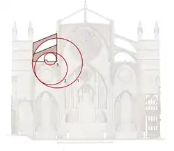 Originally used to support inclined structures, like stairs or ramps,[4] in the 13th-14th centuries the rampant arch appeared as parts of flying buttresses used to counteract the thrust of Gothic ribbed vaults,[5] typical design was based on a truncated semicircular arch. Viollet-le-Duc in 1854 described two arch types in buttresses: the earlier one where the center of the intrados segment is located on the face of the wall (intrados close to a quarter-circle), and the later, more efficient, design where the center is moved inside the wall, narrowing the segment. The main purpose of a buttress is to relay the thrust to the foundations, the structure also accommodates the downspouts.[6] A typical flying buttress used a single-arch arrangement, although two-tiered arches and even three-tiered designs were used.[7]