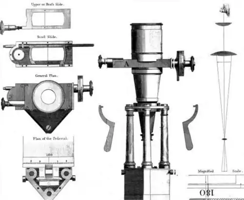 The horizontal circular scale was divided very accurately with divisions at 15 minute (of arc) intervals using one of Ramden's own dividing engines;[5] the marks on the 36-inch (910 mm) diameter scale would be about 1⁄6 inch (4.2 mm) apart. The position of the telescope could therefore be read to the nearest quarter of a degree by eye but the exact position between the divisions was read with the aid of micrometer microscopes fitted with adjustable cross wires in the focal plane, as shown. The threads of the screws were such that fifteen full turns moved from one scale mark to the next, i.e. 15 minutes, and since the scale on the adjusting knob allowed one sixtieth of a turn to be measured the resulting accuracy was within one arc second.
