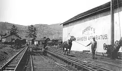 Union Pacific Railroad (particularly along the Oregon Short Line Railroad) operated several Ramsey car-transfer apparatuses among various gauge breaks inherited from predecessor lines such as the Utah and Northern Railway and Utah Western Railway, in locations such as Salt Lake City, Utah, Ogden, Utah, and Pocatello, Idaho.[3][4] In Ogden, Ramsey devices allowed interchange between the standard gauge Union Pacific and Central Pacific Railroad mainlines with narrow gauge routes on the Oregon Short Line and Denver & Rio Grande Western Railway. Union Pacific operated extensive interstate traffic using the Ramsey transfer, such as shipping narrow gauge coal cars originating on the Denver, South Park & Pacific Railroad to Butte, Montana with Ramsey transfers when needed to account for the gauge breaks.[5]