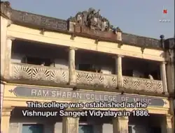 Ramsharan College of Music (also known as Bishnupur Sangeet Vidhyalaya and Vishnupur Sangeet Vidhyalaya ) is one of the oldest music college in Bishnupur, Bankura, West Bengal. This college was established as the Bishnupur Sangeet Vidhyalaya in 1886. It is also considered as oldest music college in India. Initially it was a music school but in 1945, this school was converted as a college by sangeet guru Ramsharan Mukhopadhyay. Presently this college offers two courses - one is certificate course of four years duration and another is diploma course of two years duration.