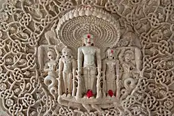 Chaturmukha temple is a 15th-century temple dedicated to Adinatha[18] built using white marble in the midst of a forest. The temple name is credited to its design of chaumukha— with four faces.[19][20] The construction of the temple and quadrupled image symbolise the Tirthankara's conquest of the four cardinal directions and hence the cosmos.[21][22] The temple is one of the largest Jain temples[3] and considered one of the five holiest Jain shrines in India and part of Gorwad Panch Tirth.[6][23] The architecture and stone carvings of the temple are based on the Ancient Mirpur Jain Temple at Mirpur in Rajasthan.[24]