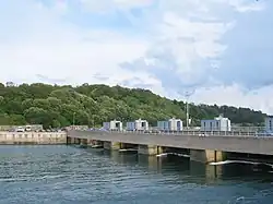 A tourist facility at the dam is open to visitors.[11] The facility attracted approximately 40,000 visitors in 2011. A lock for navigation at the west end of the dam allows the passage of 1,600-tonne vessels between the English Channel and the Rance. Departmental road 168 crosses the dam and allows vehicles to travel between Dinard and Saint-Malo. There is a drawbridge where the road crosses the lock which is raised to allow larger vessels to pass. The Rance estuary is the first part of the inland waterway from the English Channel to the Bay of Biscay via the Canal d'Ille-et-Rance and the river Vilaine.[12]