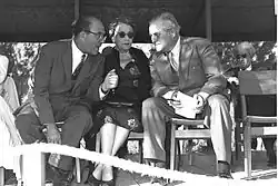 Randolph reported from the German elections in July 1932.[39] Randolph encouraged his father to try to meet Adolf Hitler in summer 1932 whilst he was retracing the Duke of Marlborough's march to Blenheim (Winston was writing the Duke's life at the time); the meeting fell through at the last minute as Hitler excused himself.[38] Randolph had an affair with Doris Castlerosse in 1932, causing a near fight with her husband. She later claimed to have had an affair with his father Winston in the mid-1930s, although Winston's biographer Andrew Roberts believes the latter claim unlikely to be true.[42][43]