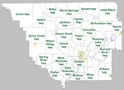 Townships in Arkansas are the divisions of a county. Each township includes unincorporated areas; some may have incorporated cities or towns within part of their boundaries. Arkansas townships have limited purposes in modern times. However, the United States census does list Arkansas population based on townships (sometimes referred to as "county subdivisions" or "minor civil divisions"). Townships are also of value for historical purposes in terms of genealogical research. Each town or city is within one or more townships in an Arkansas county based on census maps and publications. The townships of Randolph County are listed below; listed in parentheses are the cities, towns, and/or census-designated places that are fully or partially inside the township.[44][45]