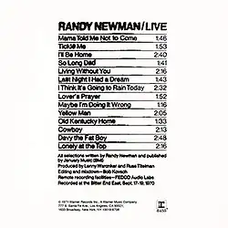Randy Newman Live is a live album by American singer Randy Newman. It is one of only two official live recordings he has released (the other was 2011's Live in London.) The album was recorded over three evenings between September 17 and 19, 1970 at the Bitter End, New York.