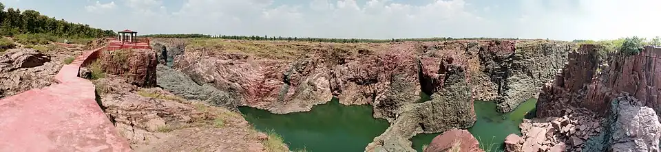 The Ken River forms a 5 kilometres (3.1 mi) long, and 30 metres (98 ft) deep canyon made of pure crystalline granite in varying shades of colours ranging from pink and red to grey. There is a series of waterfalls in the canyon. The larger and smaller falls run all through the year. Other seasonal falls appear during monsoons.[1][2]
