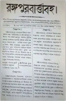 Rangapur Bartabaha (Bengali: রঙ্গপুর বার্ত্তাবহ) was a weekly newspaper published in East Bengal. It was published from August 1847 (Bhadra, 1254 BS) until 1854 with funding from Kalichandra Ray, the zamindar of Pargana Kundi. It was the first Bangla weekly newspaper published in East Bengal.[1][2][3]