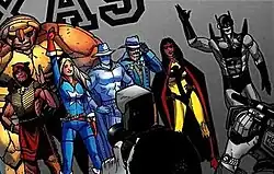 During the Secret Invasion storyline, the Rangers are seen battling a Skrull that had been impersonating Red Wolf's wolf Lobo.[10][11] They come into conflict with Kaine alias Scarlet Spider in Houston,[12][13][14] then they joined forces with him to battle a monster made of pure energy.[15]