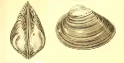 Rangia cuneata or Atlantic rangia, also known as wedge clam, gulf wedge clam, common rangia, and cocktail clam, is a mollusc native to the Gulf of Mexico. It is an oval clam with a body length of up to 5cm, living from the intertidal zone to depths of 124 meters.[2] It is edible and is harvested for food in Mexico, and has been so since pre-Hispanic times.[3]